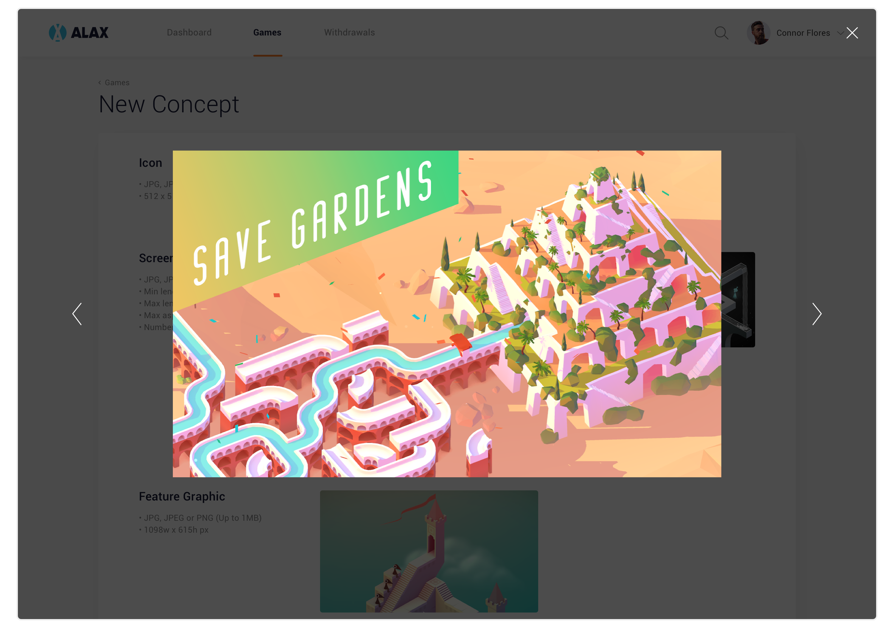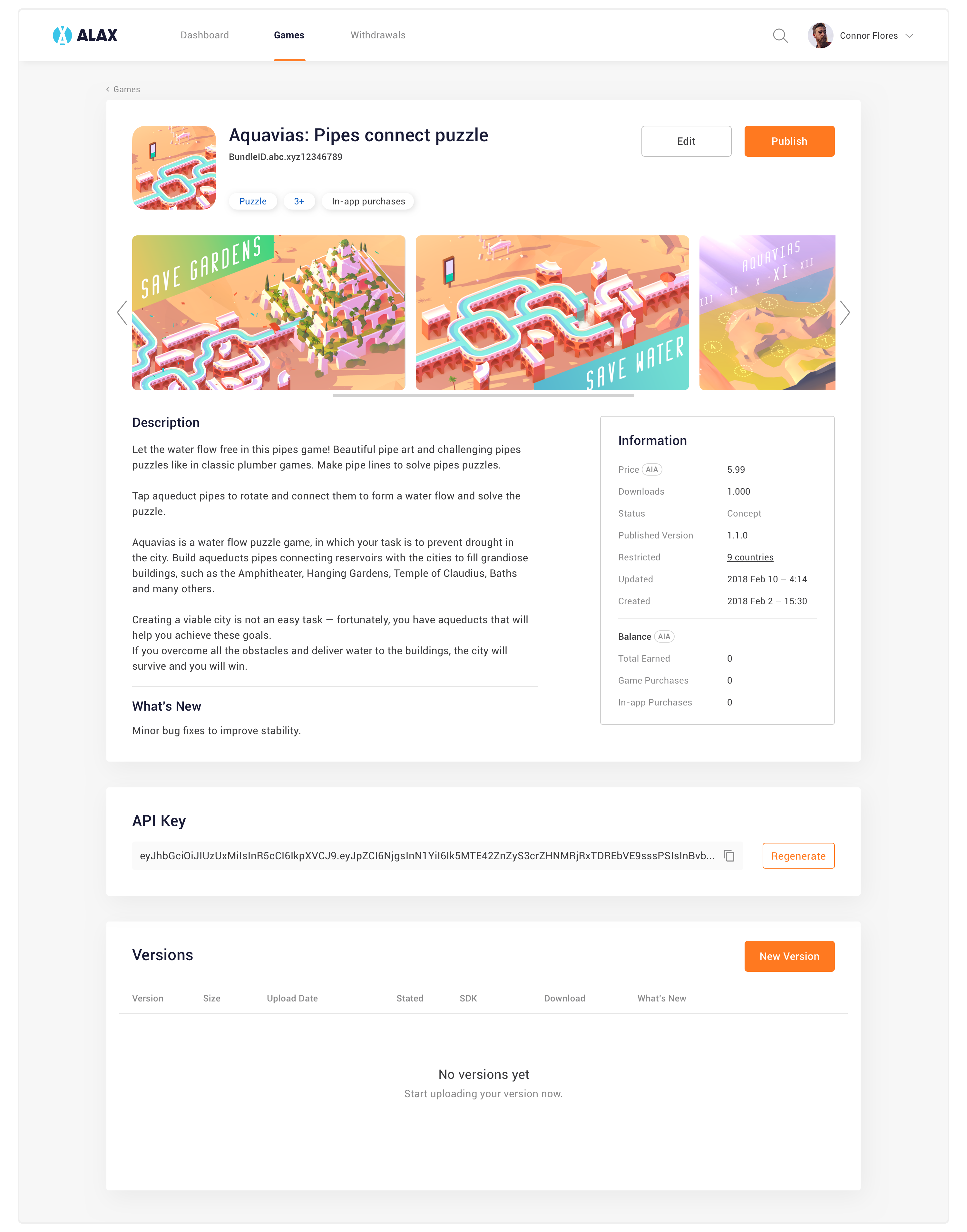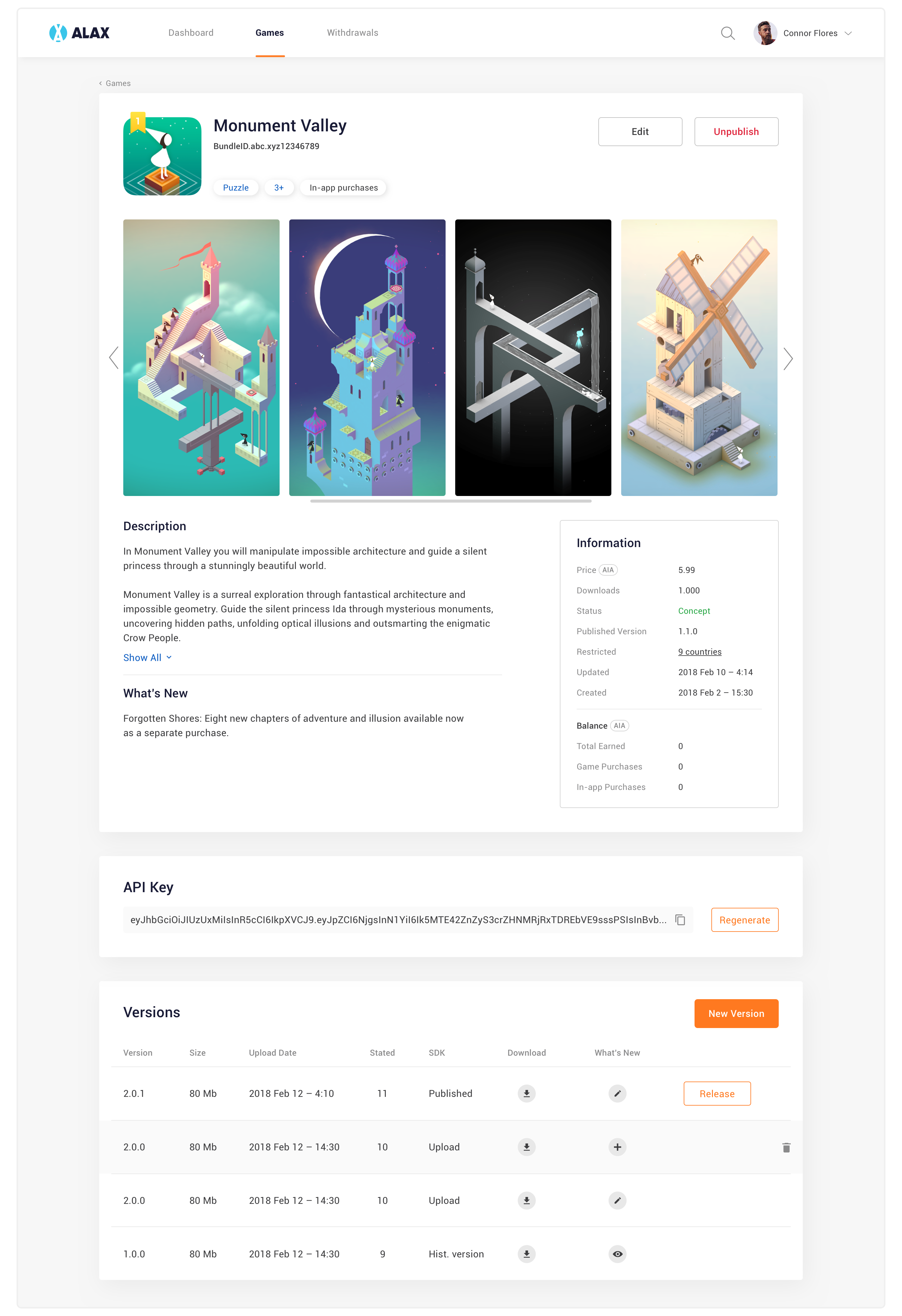 This is the biggest feature in the web app. Game Developer can create new game, add screenshots and other information then submit and wait for it to be published on ALAX Store. They can also upload new versions, search and delete their games.