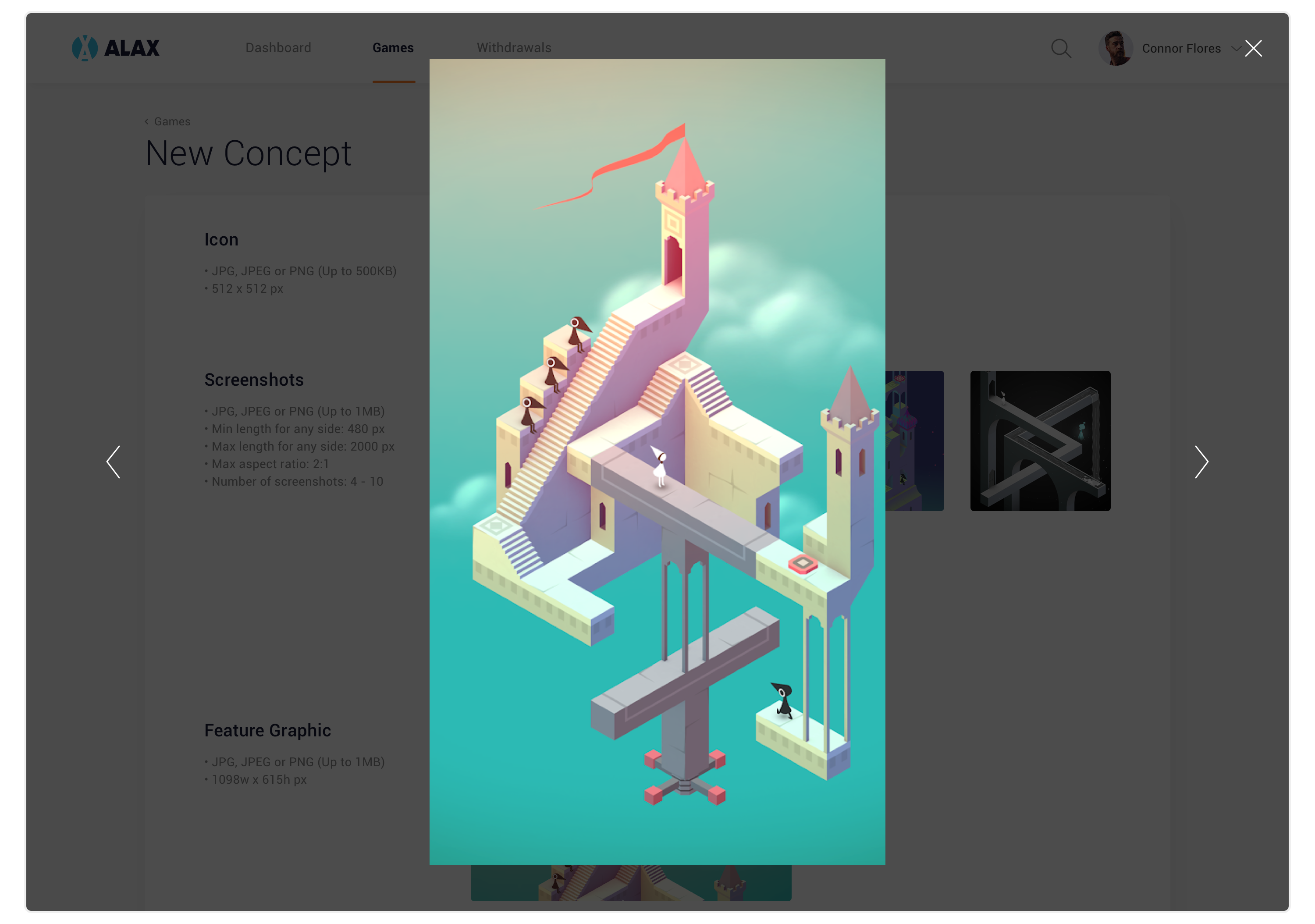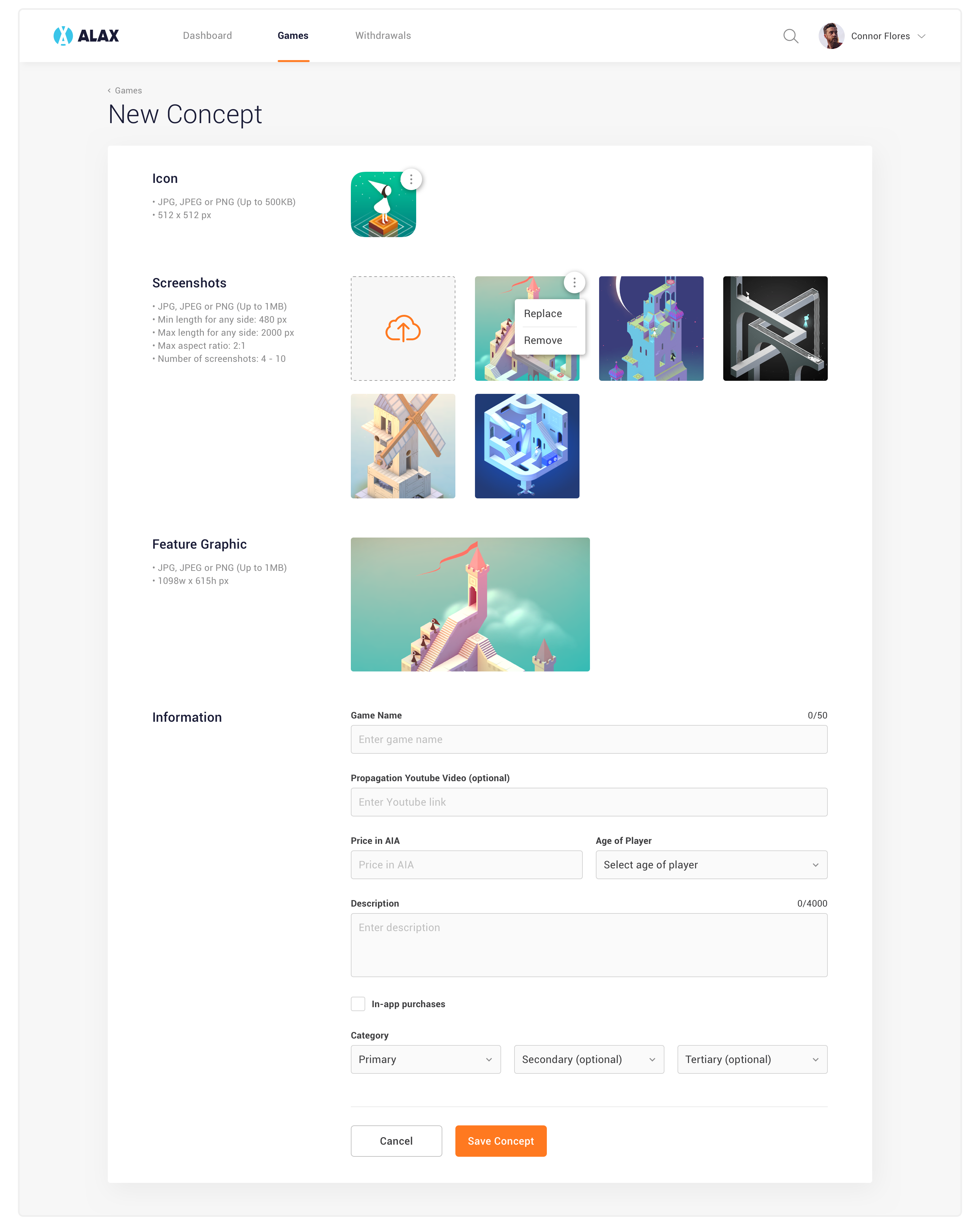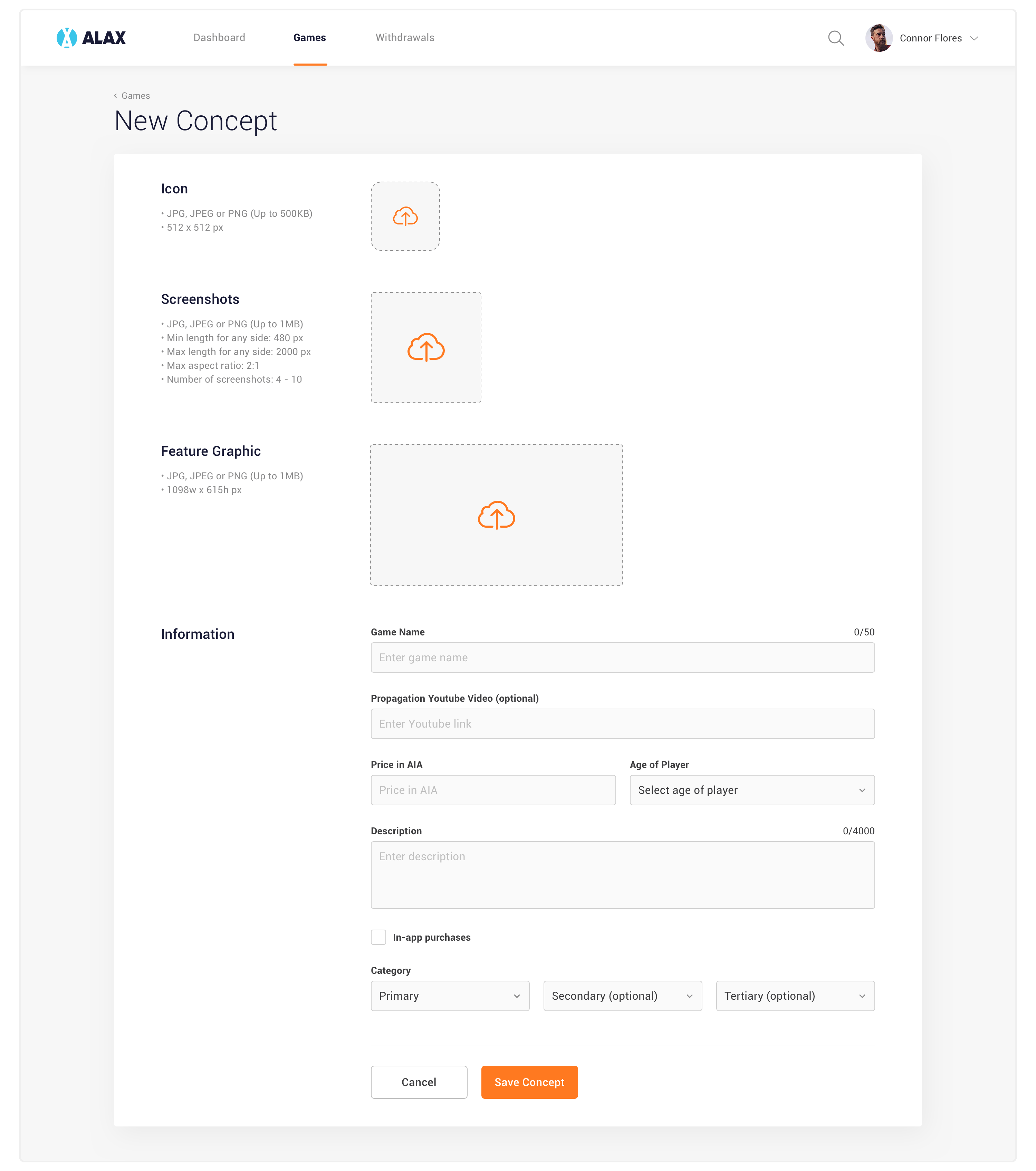This is the biggest feature in the web app. Game Developer can create new game, add screenshots and other information then submit and wait for it to be published on ALAX Store. They can also upload new versions, search and delete their games.