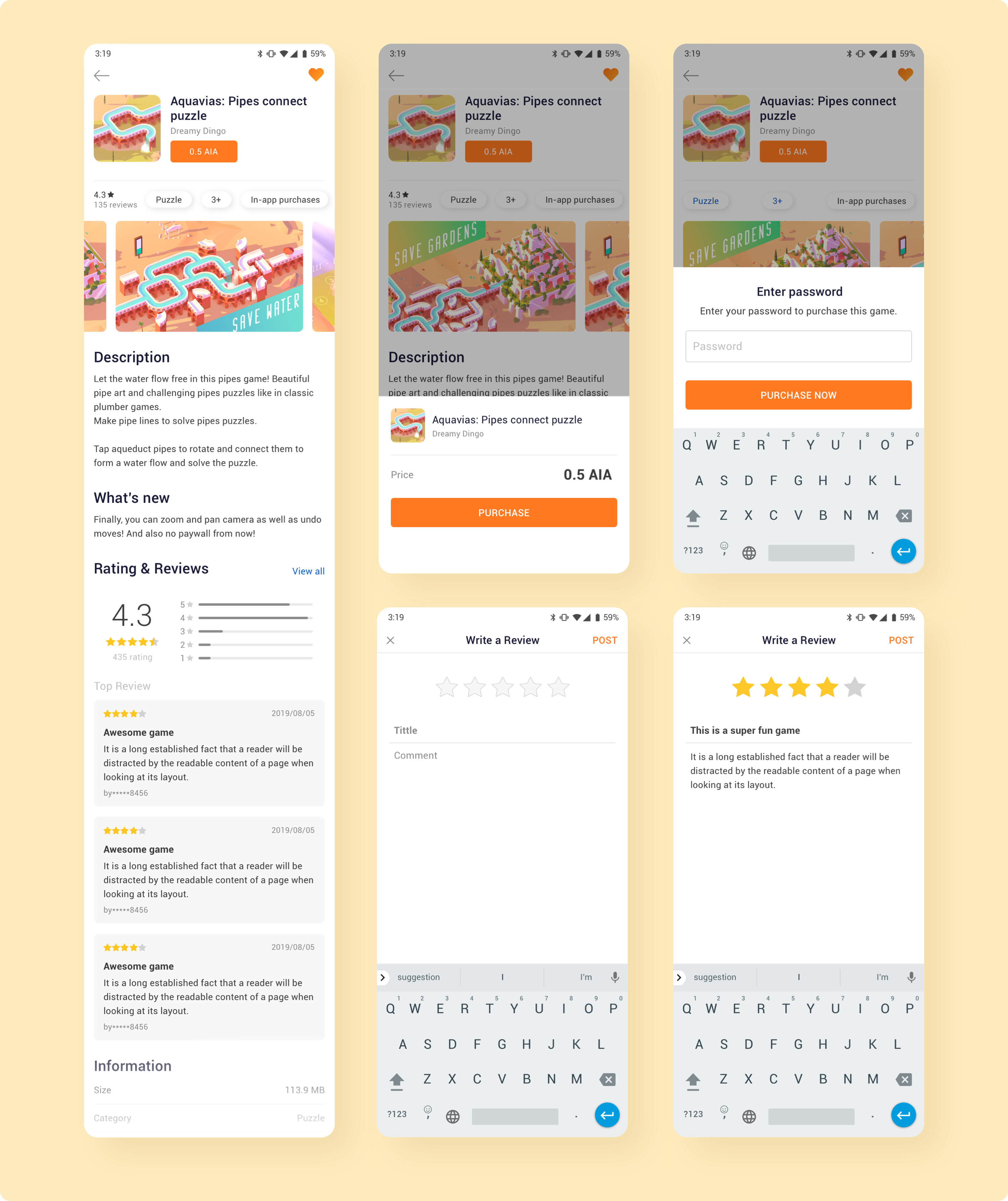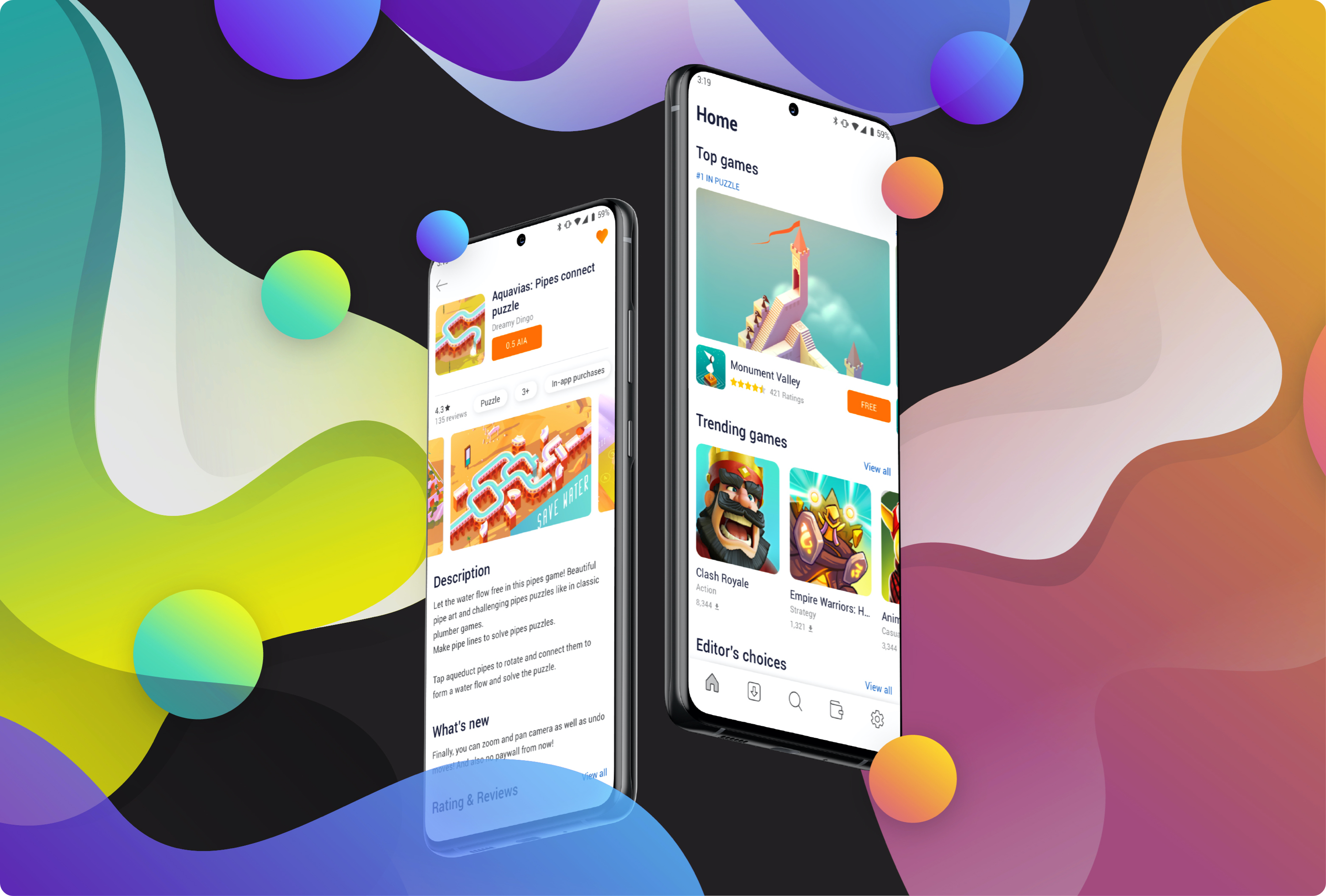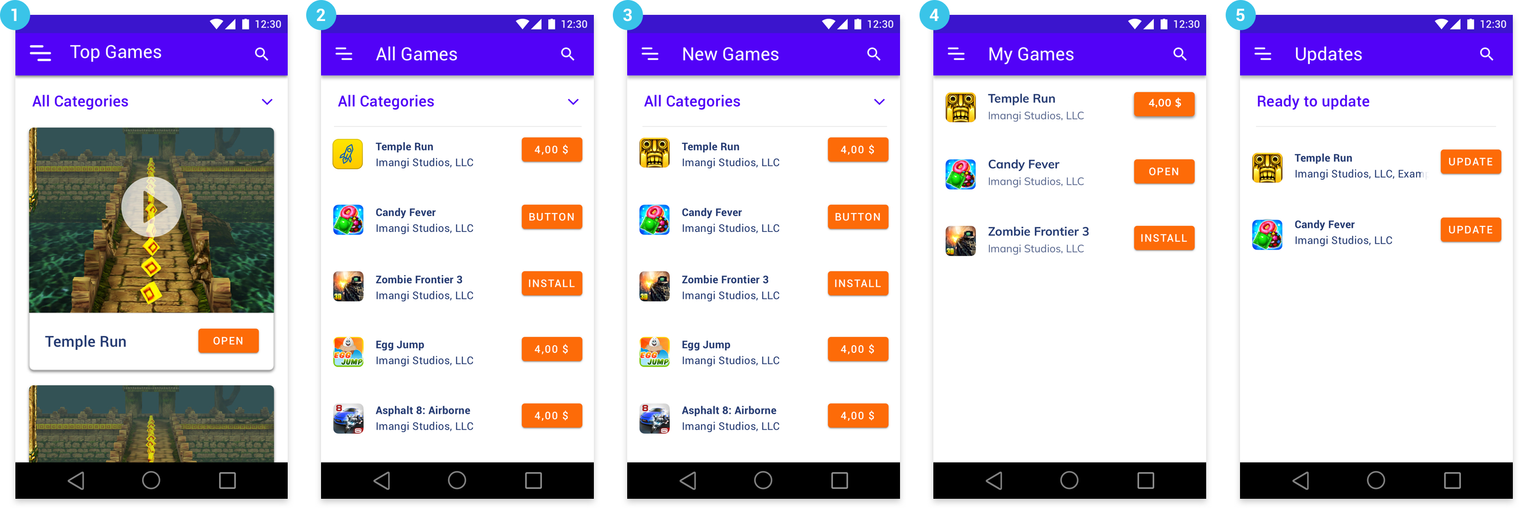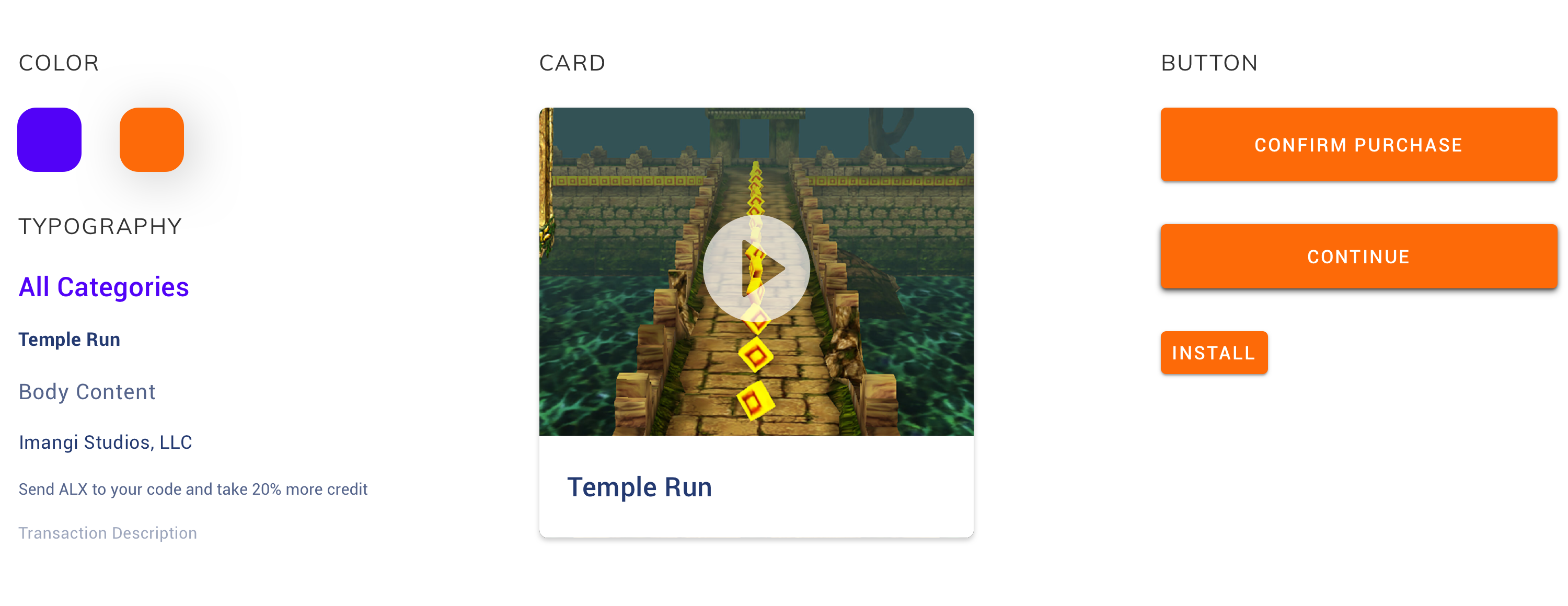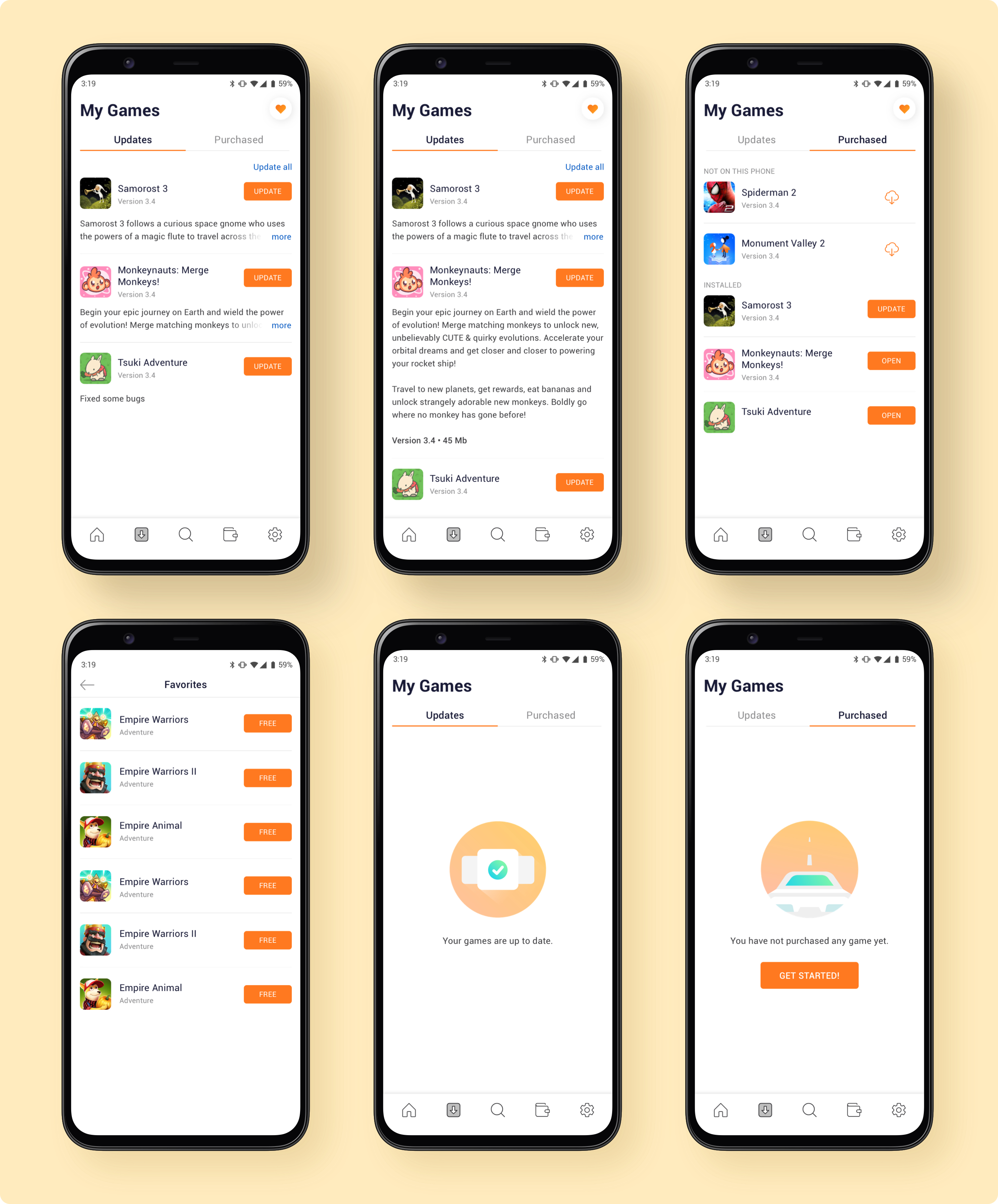 My first impression about the visual is not good. Violet blue and orange color don't work well together, creating a sense of contention. User doesn't know which color to focus on. Similar text scales makes it difficult to distinguish content sections. Shadow is bold and hash, which feels heavy. In addition, it's a game store but the layout is too simple. It lacks of images and app's information that is often found in other game stores