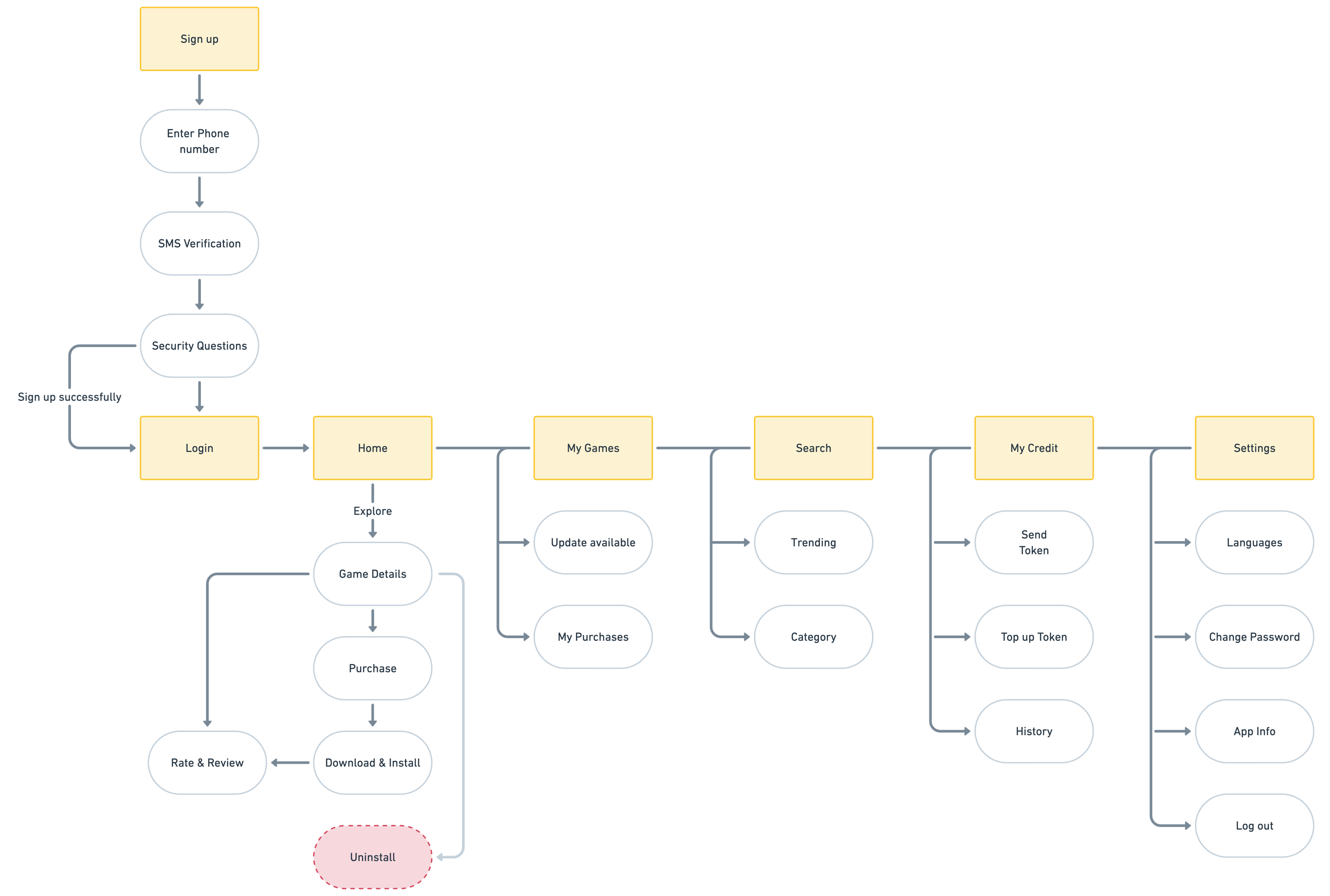 Having agreed on the main screens, I continued to identify child-level screens by drawing main flows. Based on this wireflow, I know which screens I need to design and also make it easier for the engineer team to predict the future implement timeline.