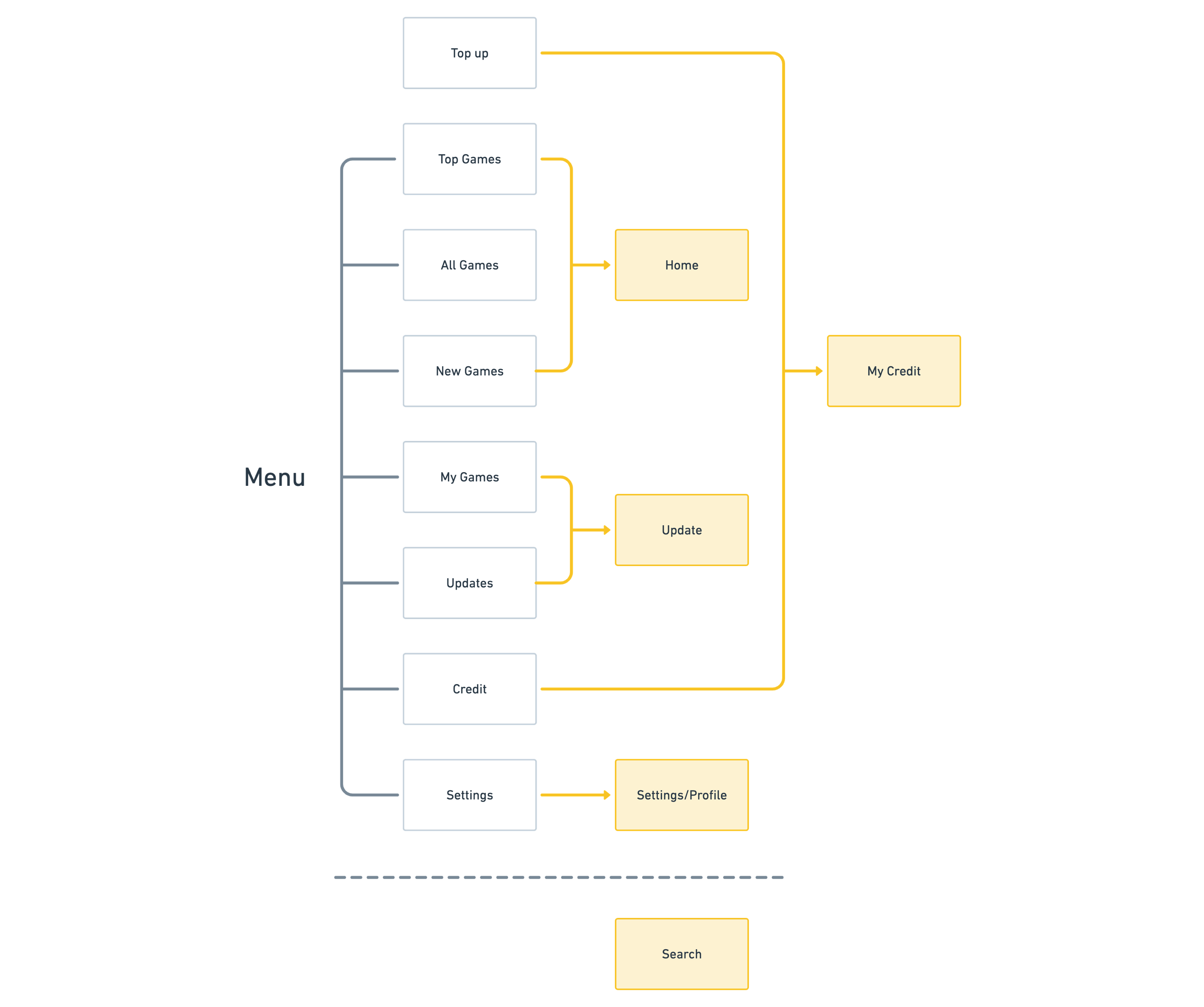 To solve the problem of the hamburger menu, I suggested organizing and grouping similar features into one main feature. Each main feature will be shown at an icon on the bottom navigation. Along with the new feature Search, there will be 5 main tabs on the bottom navigation: Home, My Games, Search, My Credit, Settings.