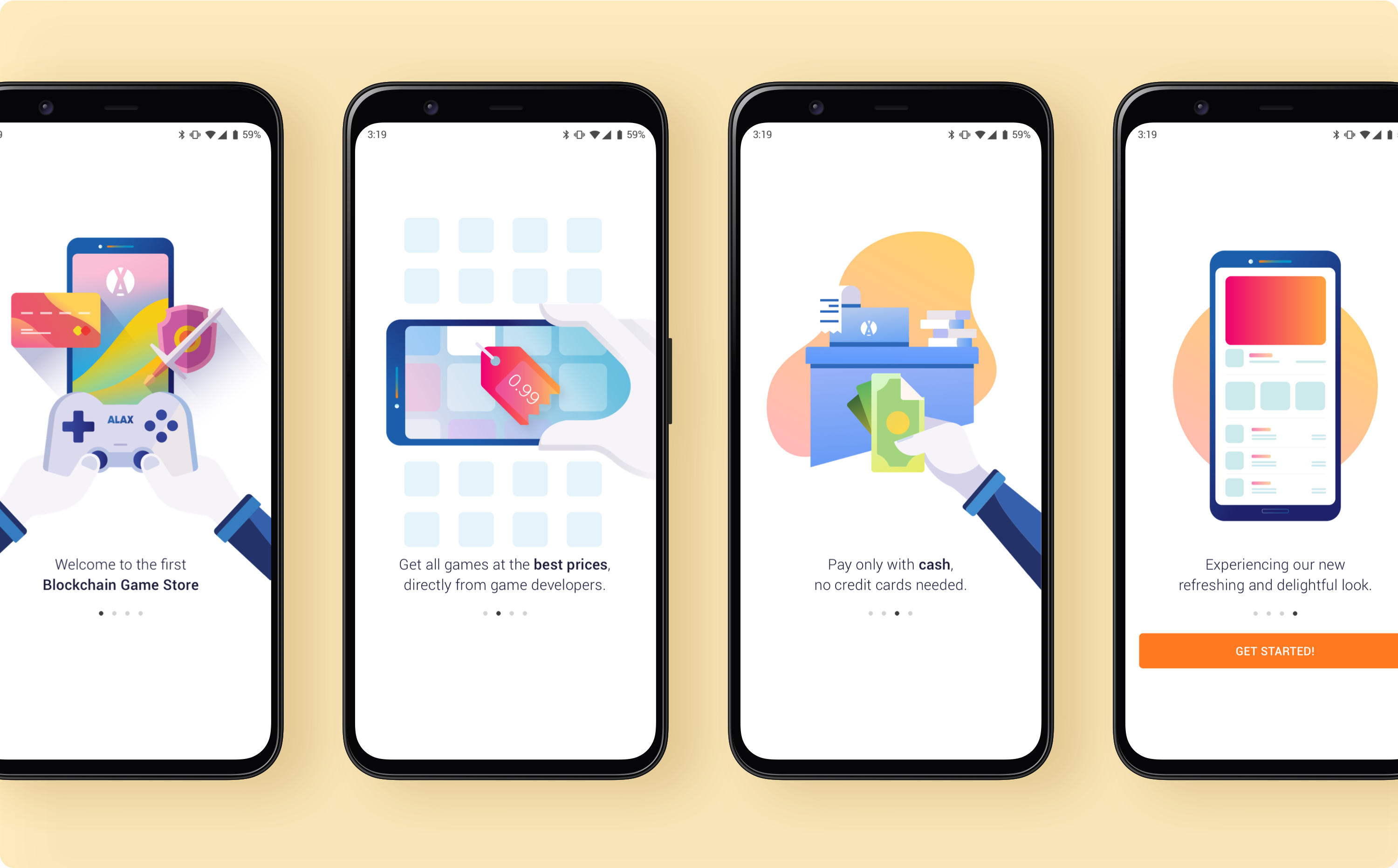 When user open the app for the first time, they will see the illustrations and short texts describing ALAX’s Store’s benefits that they can get when using it.