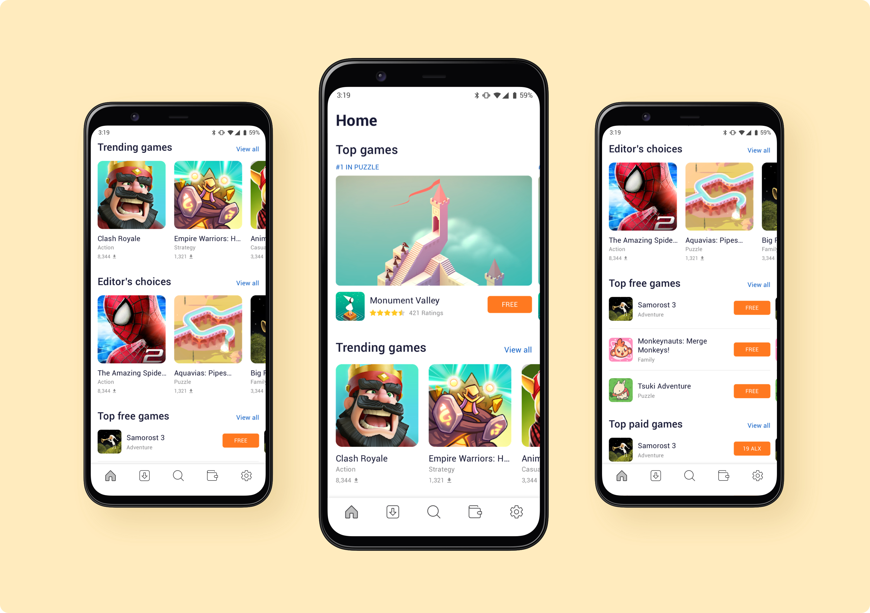 The home page is presented in the order of content priority: Top Game > Trending Games > Editor's choices > Top free games > Top paid games. Higher priority has larger image to attract users. The rating and downloads also are displayed under the title as a sign of the popularity and quality of the game. User can purchase and install the games right on homescreen.