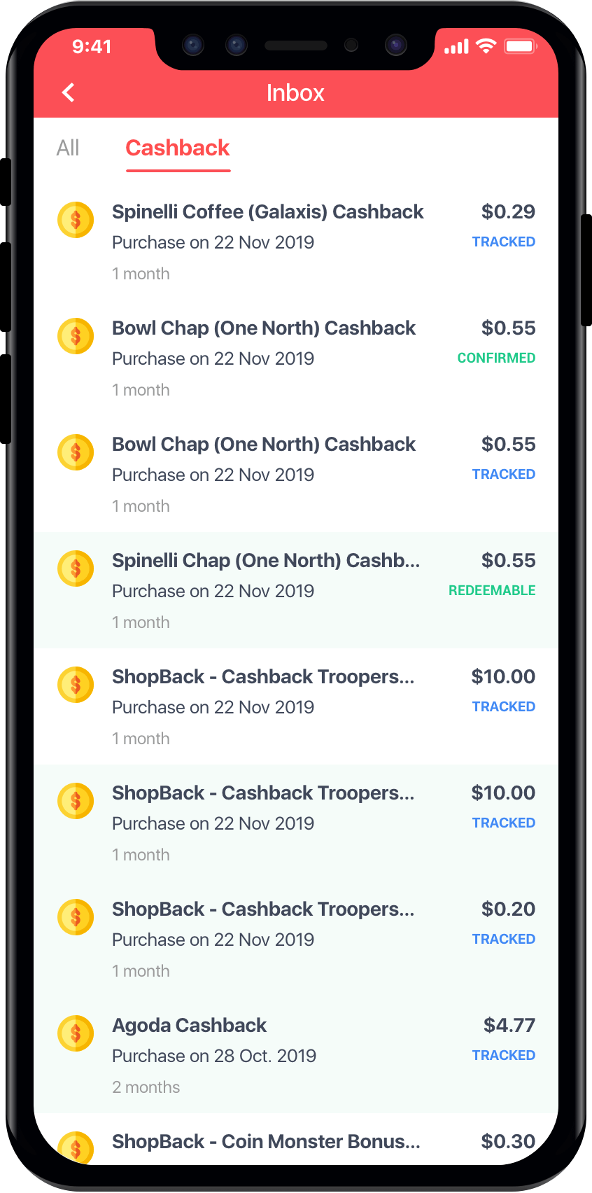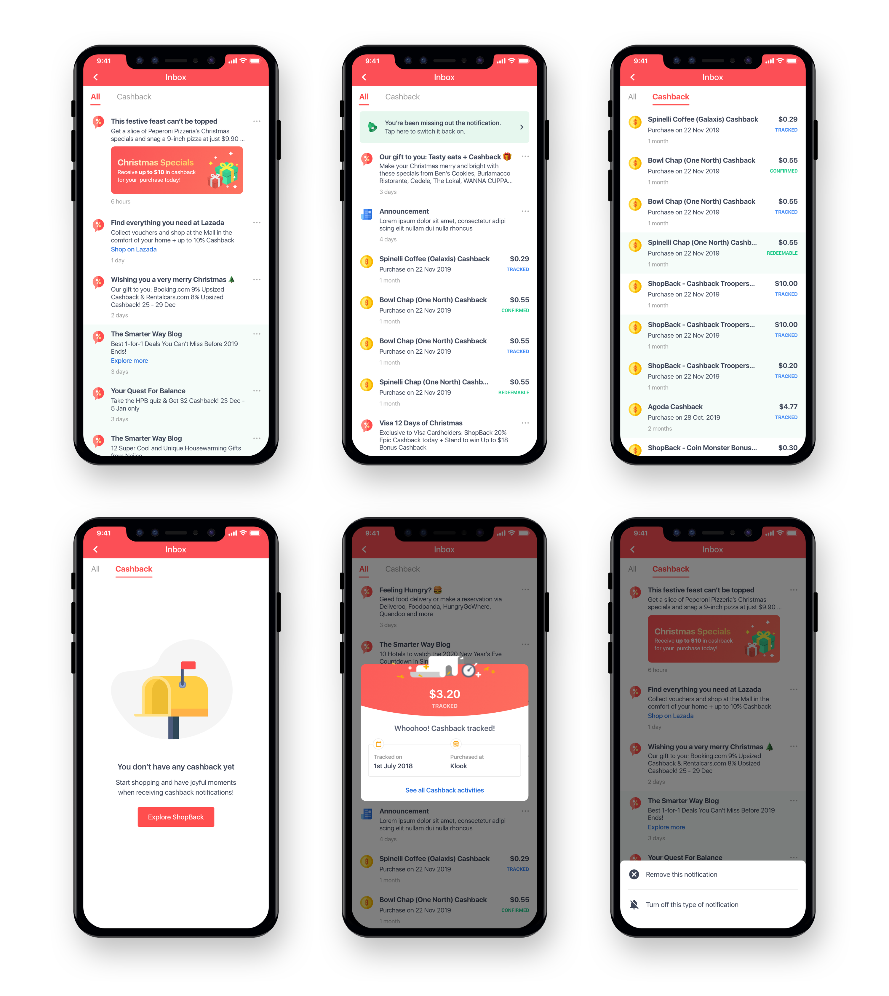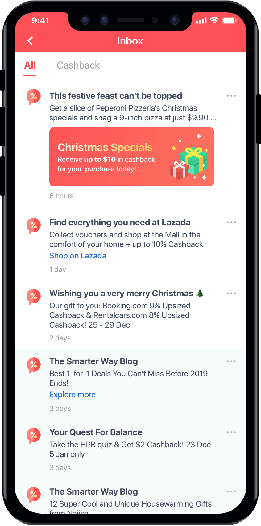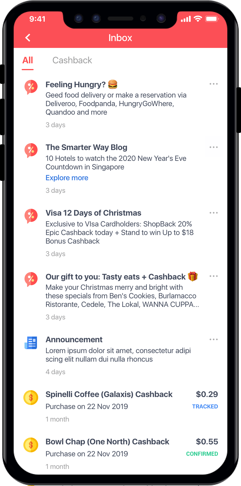 There are 3 notification types in the current Inbox: Cashback status notifications, App’s notifications, Promotions. There are 3 tabs: All, Promo and Cashback. App’s notifications have no own tab and are under All tab. User can tap on the icons to navigate between the tabs. The format of each type are basically the same: Title, body, date. In a quick glance, I can recognize the promotions by... a bunch of emojis in the title and body. Because there are so many emojis in almost every promotion, all look the same and uninteresting to me. I feel like looking at my email’s spam folder and obviously don’t want to open any of it. I can still distinguish the Cashback notifications by the money and status on the right side of the notification though, and easily navigate to the Cashback tab to view only the Cashback notifications.