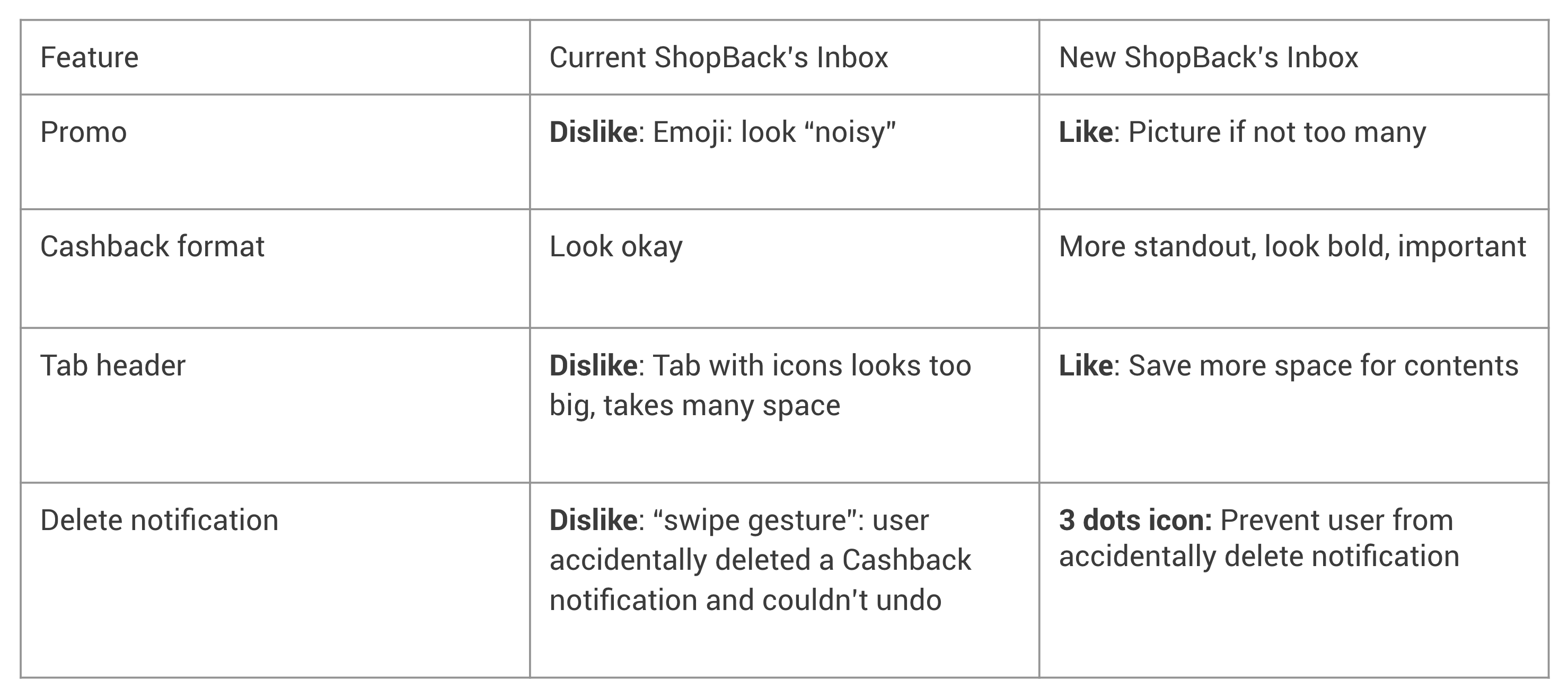 After finalize the design, I did the hi-fi prototype and asked the users who I interviewed before to try the new version of ShopBack’s Inbox. I wrote down their opinions and revised the designs based on their reasonable points. Below is the summary of users’ comparison between the old/current and the new ShopBack’s Inbox.