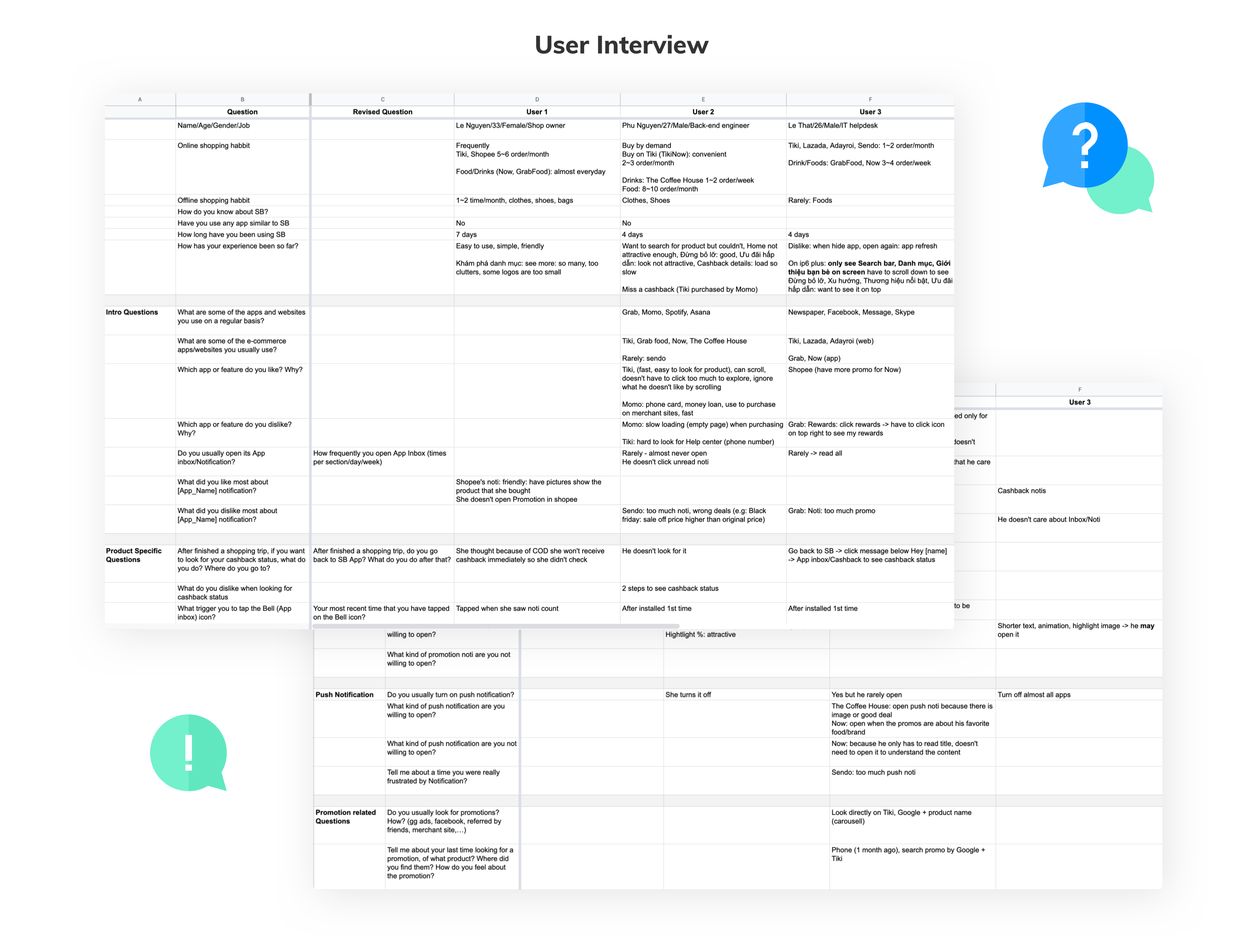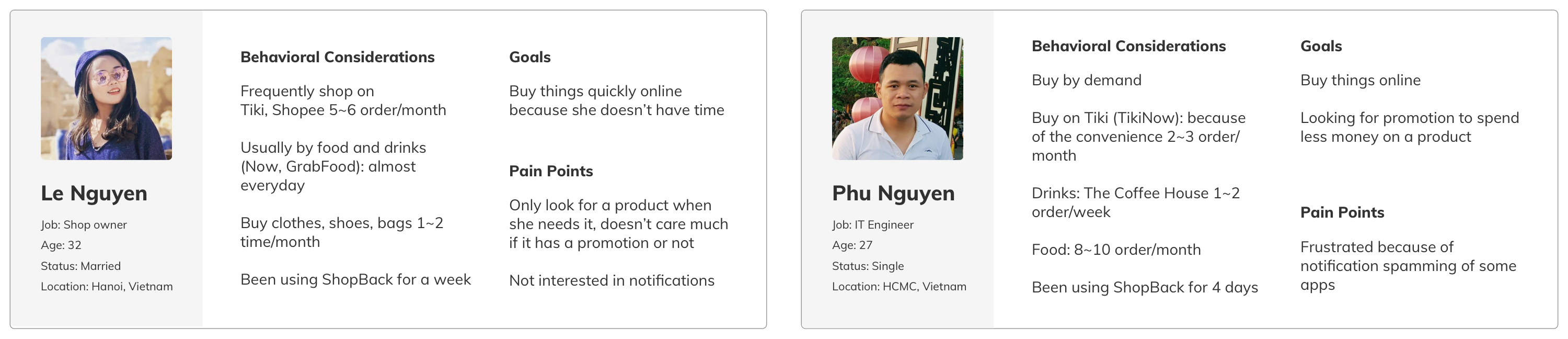 At that time, ShopBack Vietnam didn’t have budget for user interview, therefore I asked my friends to use ShopBack for a while then did the interview with them. I did 2 interviews face to face and 1 through a Skype call, 30 minutes for each one. Below are the personas and the spreadsheet with my questions and their answers.