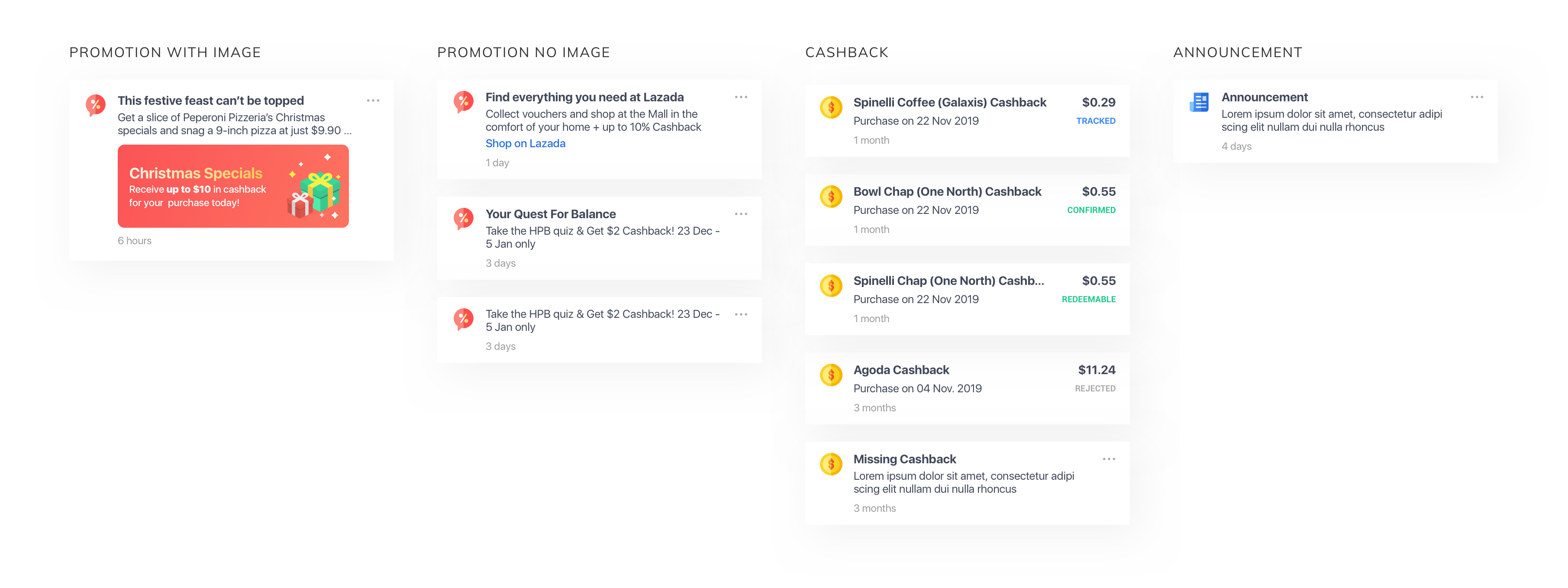I discussed with the Project Manager to determine the type of notifications and their structures (icon, title, body content, cashback number and cashback statuses, etc). Then we will discuss with the Marketing team to have a guideline for each element in the structure.There will be 2 promotion’s type: Promotion without image and promotion with image for when we need to emphasize a special promotion, and we can sell that spot as an advertisement for merchants.