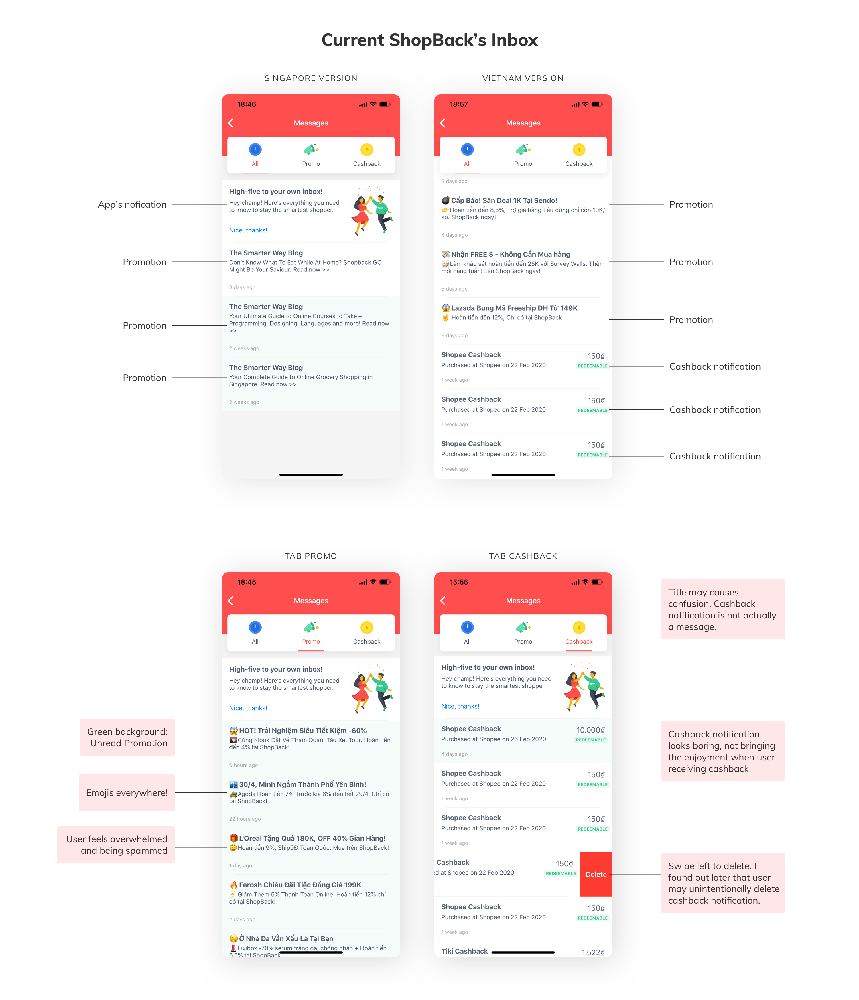Inbox (or Notification) is one of the most common features in mobile apps. User opens Inbox to view the app’s announcements, notifications then tap on it to be redirected to a specific screen that contains the information they want or need to see. In e-commerce app market, Inbox is not just a place to display notifications. It’s also a potential area to introduce user to the relevant promotions and deals in a form of notifications. By checking Inbox, user may intentionally or accidentally open a promo notification, therefore likely increases the chance of shopping and purchasing, which helps to increase the company’s profits. The question is how can I help ShopBack earn more profits with the app’s Inbox?First observations