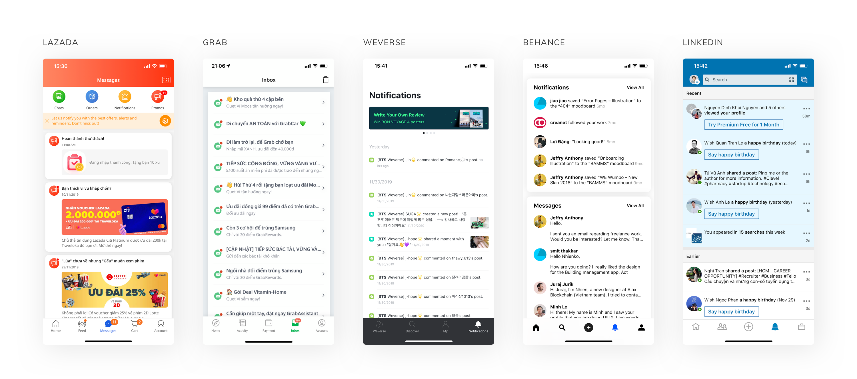 I looked into e-commerce apps and also popular apps to see the pattern and to get some ideas. E-commerce apps tend to have colorful Inbox, with icons, pictures and a lot of contents while popular apps lean toward simple, clear look with short text. Lazada’s Inbox has pictures in every notification. Grab displays only text and user can tab to view a details screen. LinkedIn puts CTA buttons in some special notifications to help user quickly do the next action which is related to the notification.